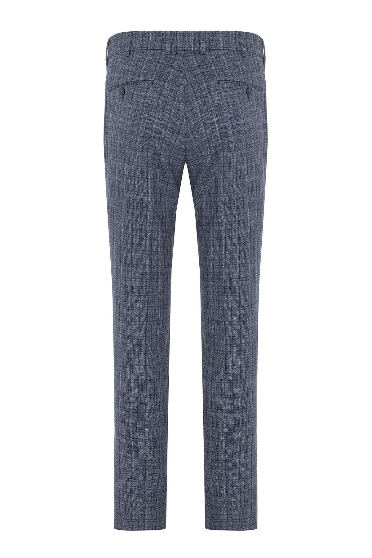 Gri ve lacivertin iç içe geçtiği ekose (kareli) deseni, pantolona derinlik ve dinamizm katarak sade üst giyimlerle dahi şık bir kontrast yaratır.