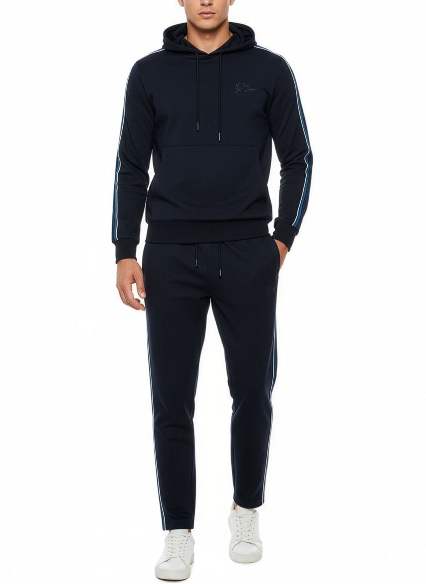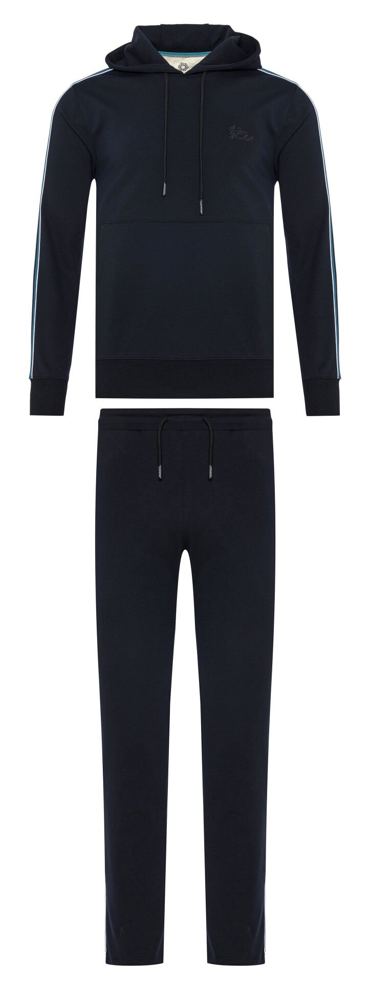 Modern ve konforlu görünümü bir arada sunan bu lacivert kapüşonlu eşofman takımı, günlük kullanım ve seyahatlerde maksimum rahatlık sağlar.