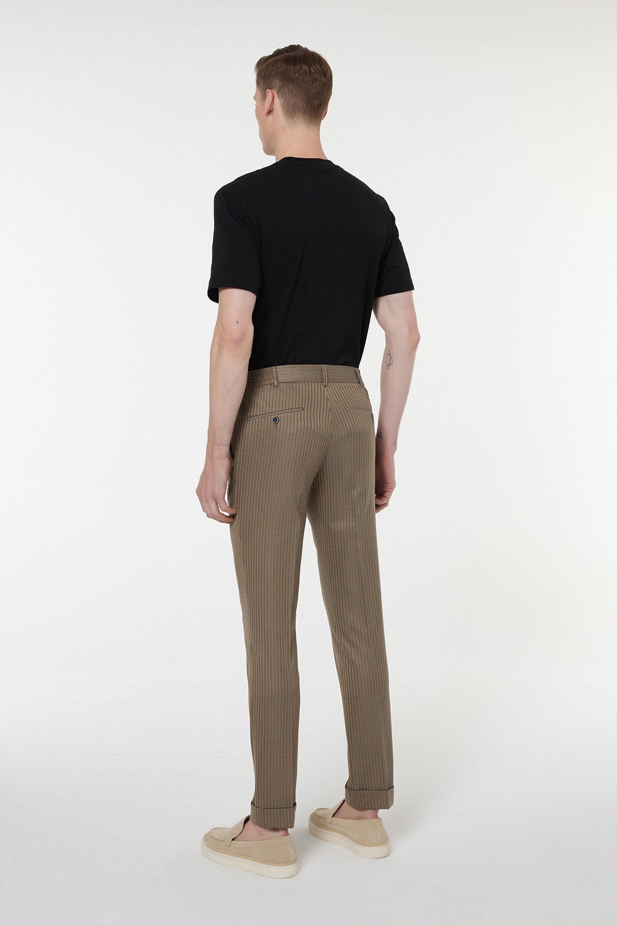- Zarif Çizgili Desen: Bej zemin üzerindeki ince çizgiler, pantolona hareket katar ve klasik, sofistike bir stil vurgular.