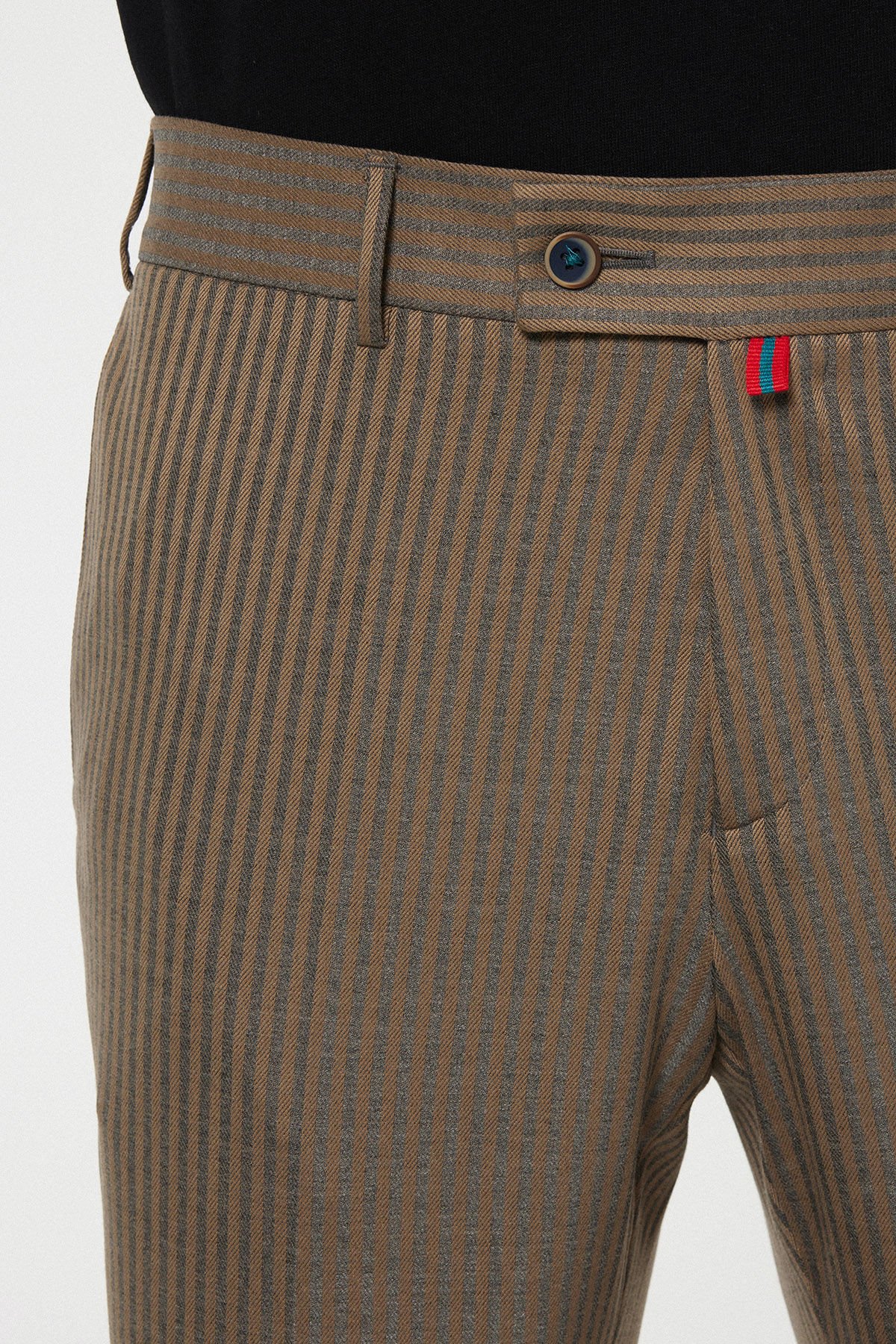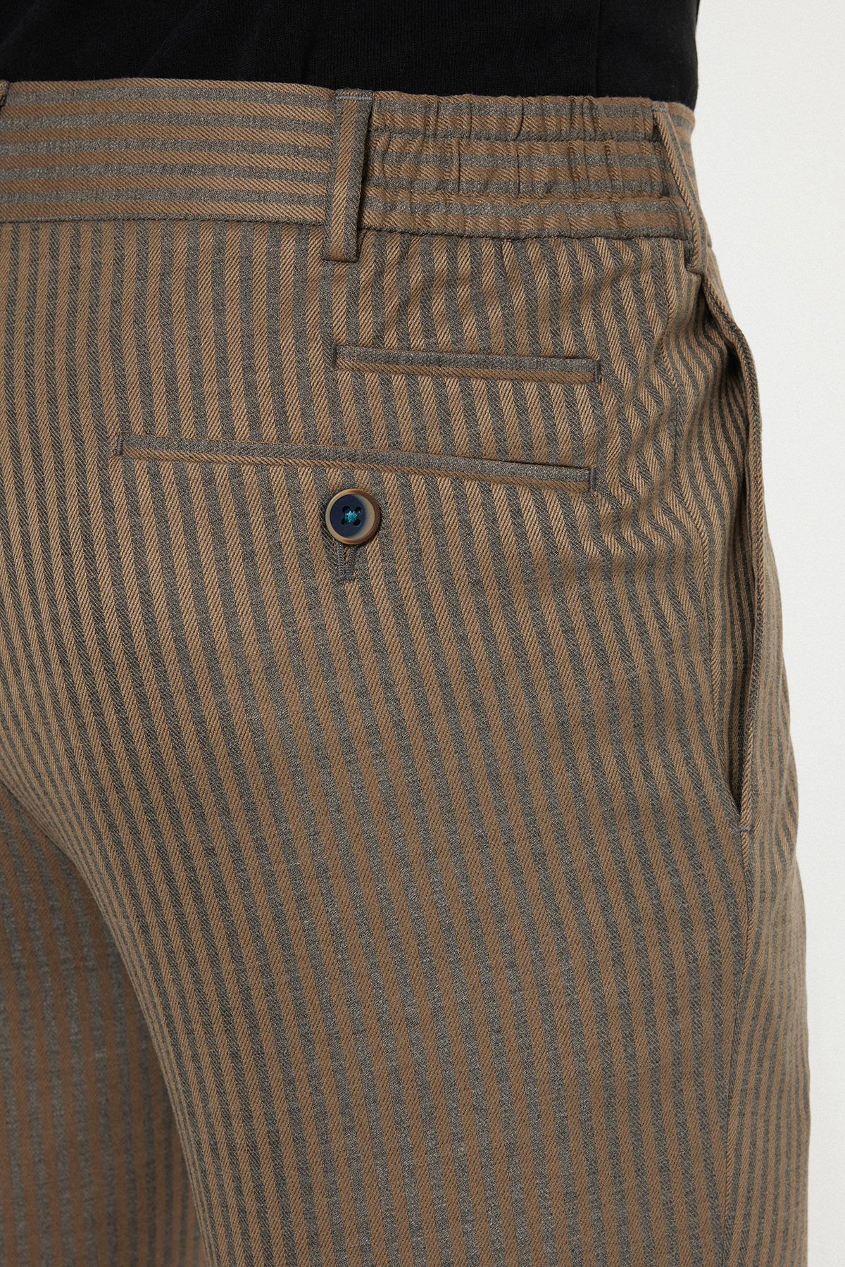 Kemer içi lastik detayı, pantolonun belde tam ve konforlu bir şekilde oturmasını garanti ederken, dışarıdan klasik bir görünüm sergiler.
