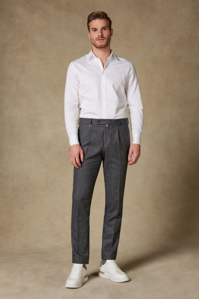 Günlük yaşam ve iş tarzına uyum sağlayan regular fit erkek kumaş pantolon. Yün karışımlı dokusu sayesinde kış aylarında sıcak tutar, elastan oranı ise gün boyu hareket konforu sunar. İnce çizgili modern tasarımı ile ofis şıklığı, smart casual ve özel davet kombinlerinde rahatlıkla kullanılabilir. Kemer köprülü yapısı ve yan/arka cepleri ile hem şık hem fonksiyoneldir.