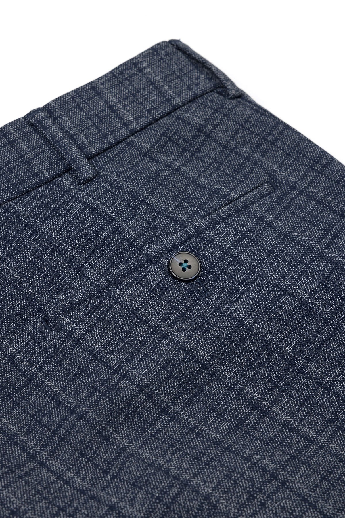 Gri ve lacivertin iç içe geçtiği ekose (kareli) deseni, pantolona derinlik ve dinamizm katarak sade üst giyimlerle dahi şık bir kontrast yaratır.