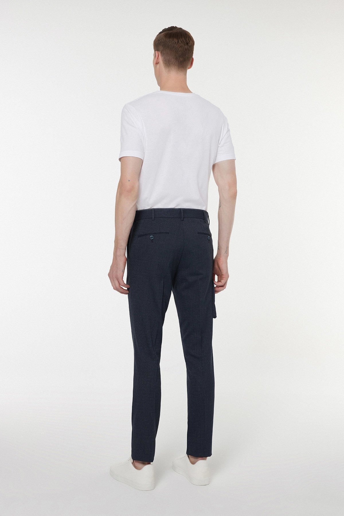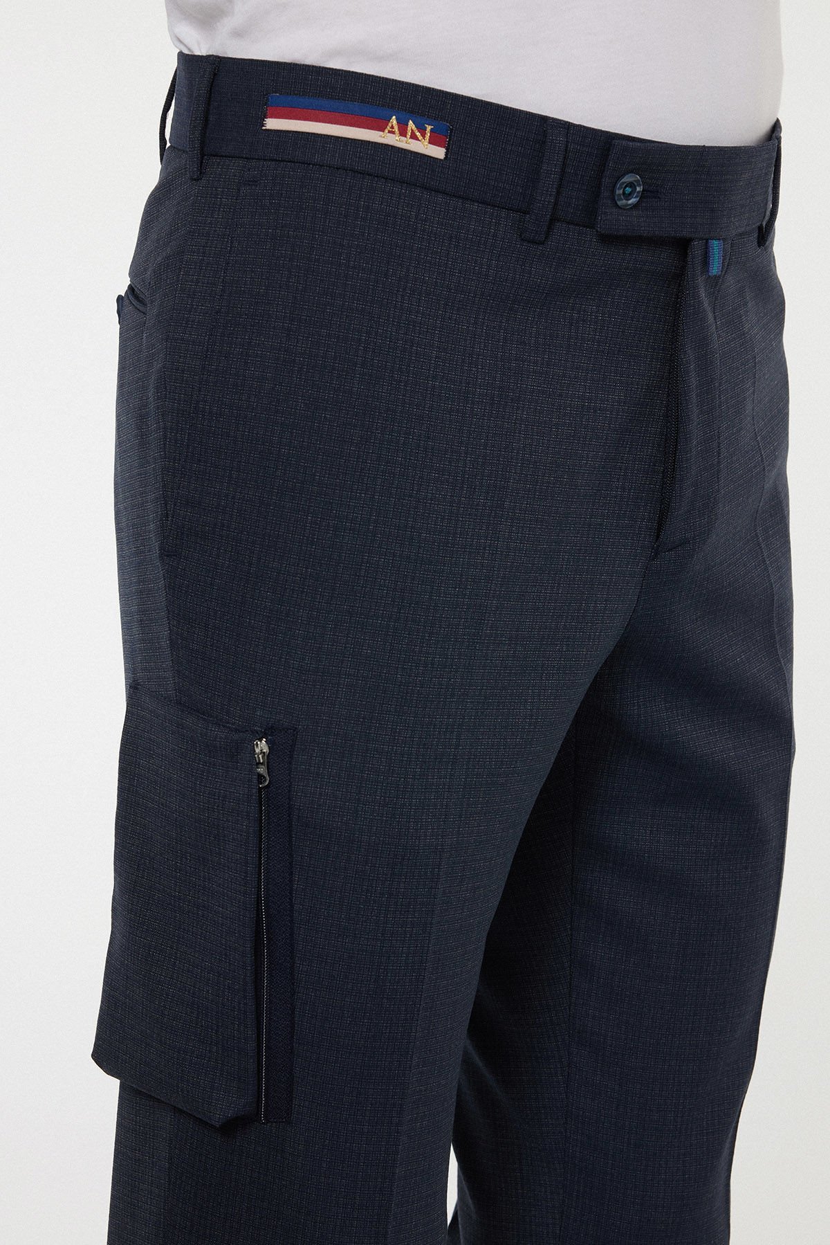 Bu Andrea Nicolotti lacivert pantolon, klasik bir görünümü modern ve işlevsel detaylarla birleştirir. Kumaşındaki zarif mikro dokuma deseni, ürüne sofistike bir hava katarken, Regular Fit (Normal Kesim) kalıbı gün boyu rahatlık ve hareket kolaylığı sunar.