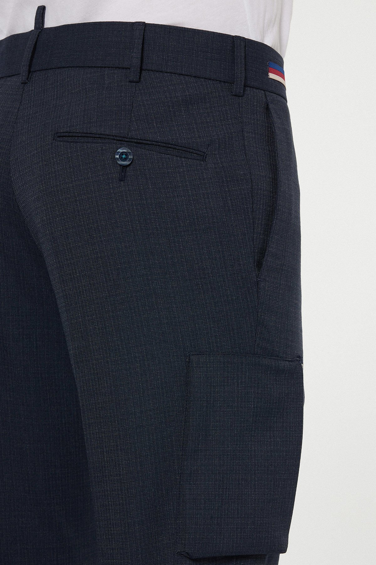 Pantolonun en dikkat çekici özelliği, diz hizasında bulunan fermuarlı kargo cep detaylarıdır. Bu cep, klasik pantolon çizgisine modern bir sokak giyimi estetiği katmakta hem de kullanışlılık sağlamaktadır. Bel kısmında yer alan tricolore (üç renkli) şerit detayı, markanın dinamik tarzını vurgular. Polyester, Viskon, Yün ve Elastan içeren esnek kumaş yapısı sayesinde, hareket özgürlüğünden ödün vermeden maksimum konfor sağlar.