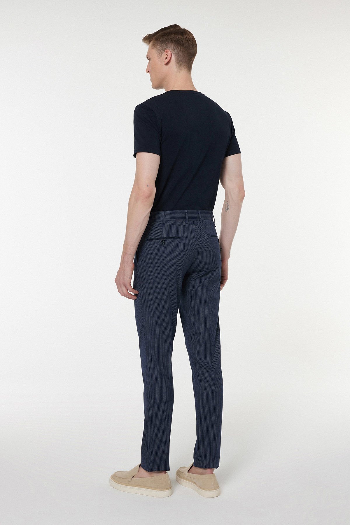 - Smart Casual: Modelde görüldüğü gibi, lacivert veya siyah bir basic tişört ile sade ve modern bir stil yaratın. Bej süet loafer veya makosen ayakkabılar ile tamamlayarak rahat ve şık bir görünüm elde edin.