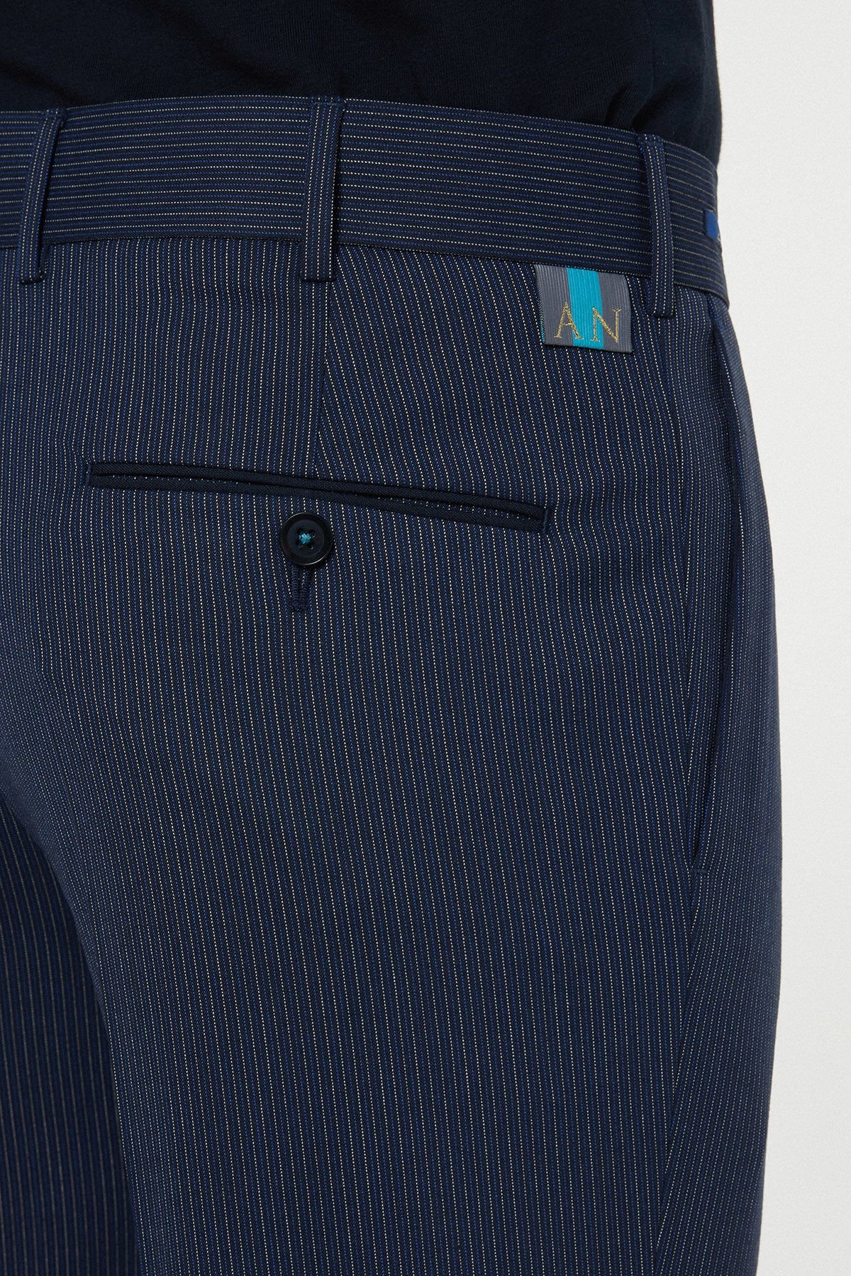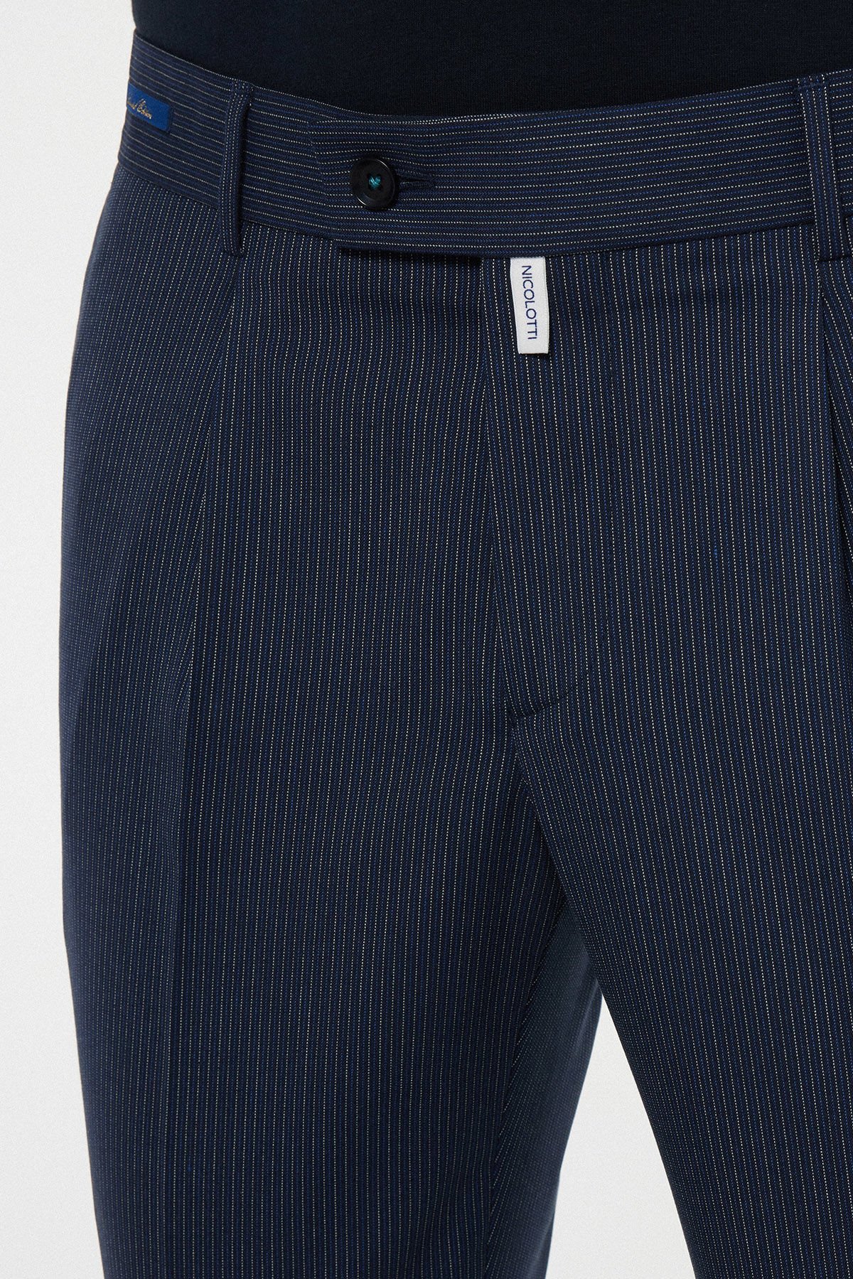 Bu Nicolotti lacivert pantolon, klasik ve zamansız bir görünüm sunar. Kumaş üzerindeki zarif, ince çizgili (pinstripe) deseni, ürüne dikey bir akıcılık ve sofistike bir hava katar. Regular Fit (Normal Kesim) kalıbı sayesinde, vücuda oturan Slim Fit pantolonların aksine, gün boyu ekstra rahatlık ve hareket kolaylığı sunar.