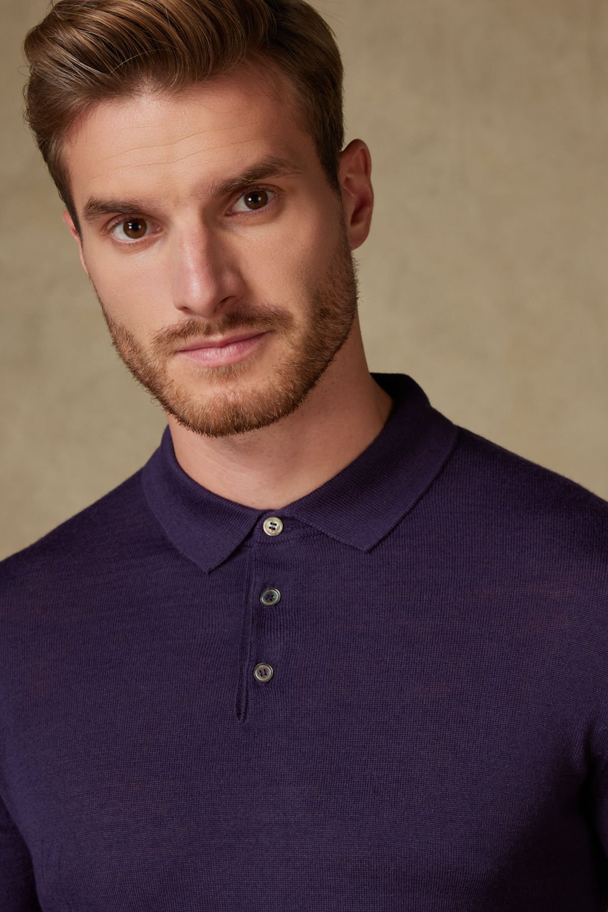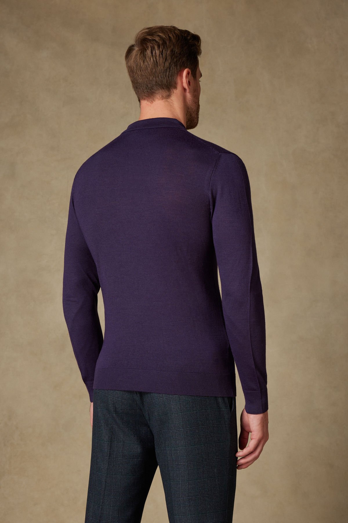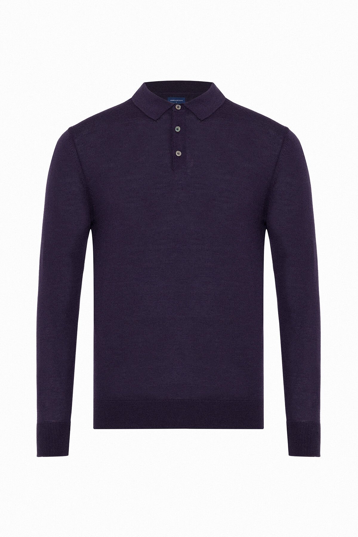 Bu koyu mor tonlarındaki uzun kollu polo triko, %50 Yün ve %50 Akrilik karışımı sayesinde yumuşak, sıcak tutan ve şık bir yapıya sahiptir.