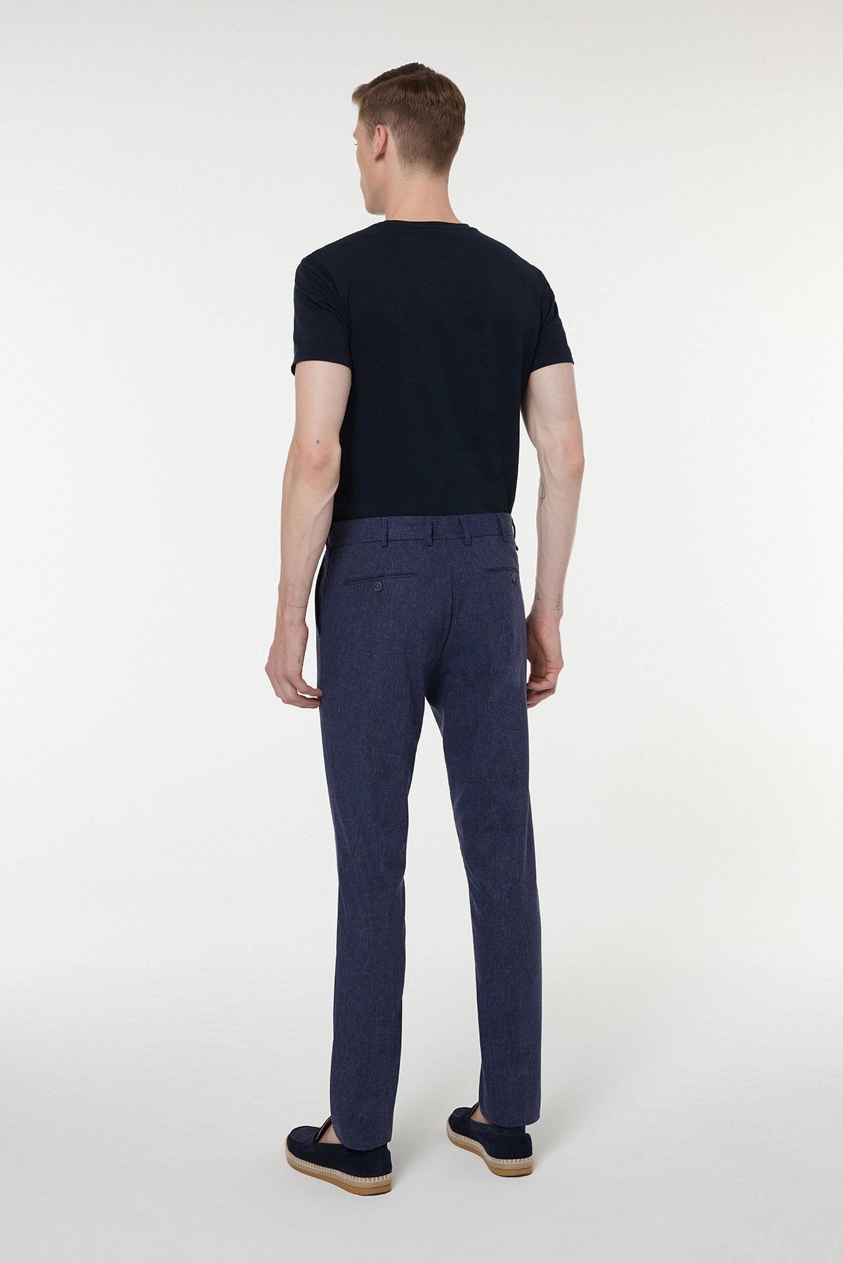 Bu lacivert melanj pantolonu farklı ortamlar için dengeli ve şık bir şekilde kombinleyebilirsiniz: