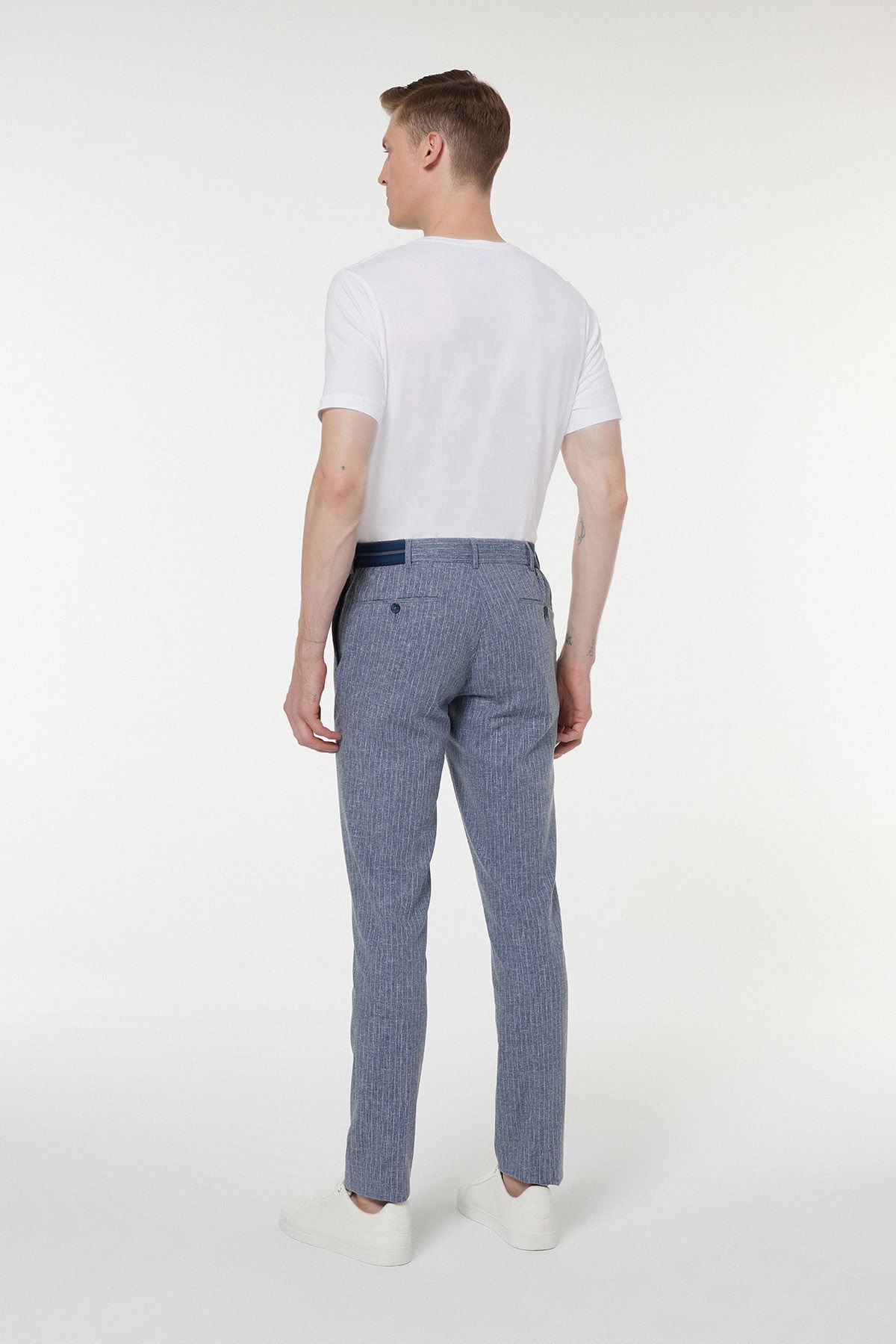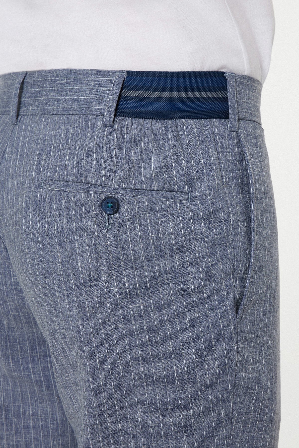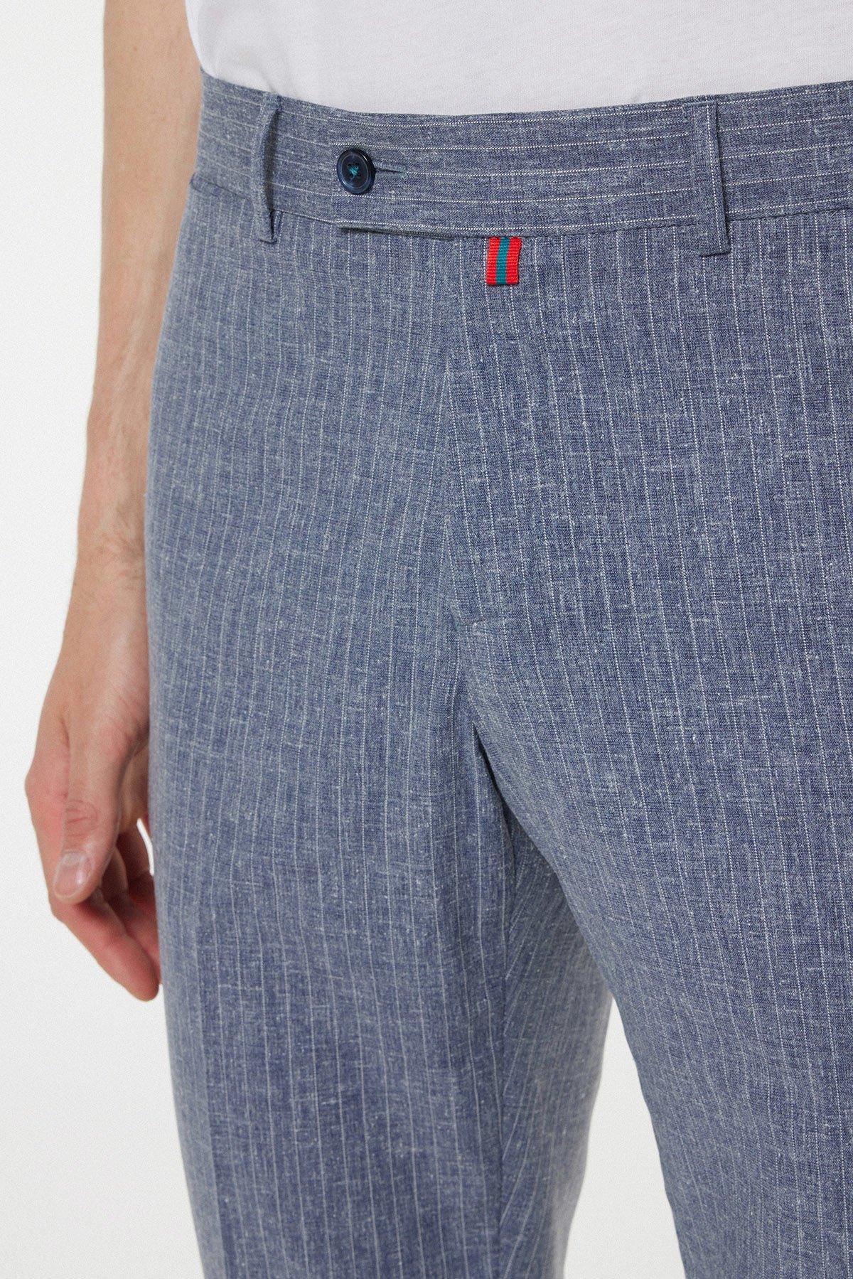Geleneksel kumaş pantolon şıklığını, özellikle sıcak mevsimlerde üstün konfor sunan teknik bir harmanla buluşturan bu mavi parça, smart casual stilinize yeni bir boyut getiriyor. Kumaş kompozisyonundaki %48 Keten, doğal bir nefes alabilirlik ve hafiflik sağlarken; %50 Polyester dayanıklılığı, %2 Elastan ise esnekliği ve hareket özgürlüğünü garanti eder. Klasik mavi tonu, iş ortamlarından sosyal etkinliklere kadar geniş bir yelpazede zahmetsizce kullanılabilir. Kemer içi gizli lastik detayı, rahatlığı ve fit duruşu bir araya getirir.