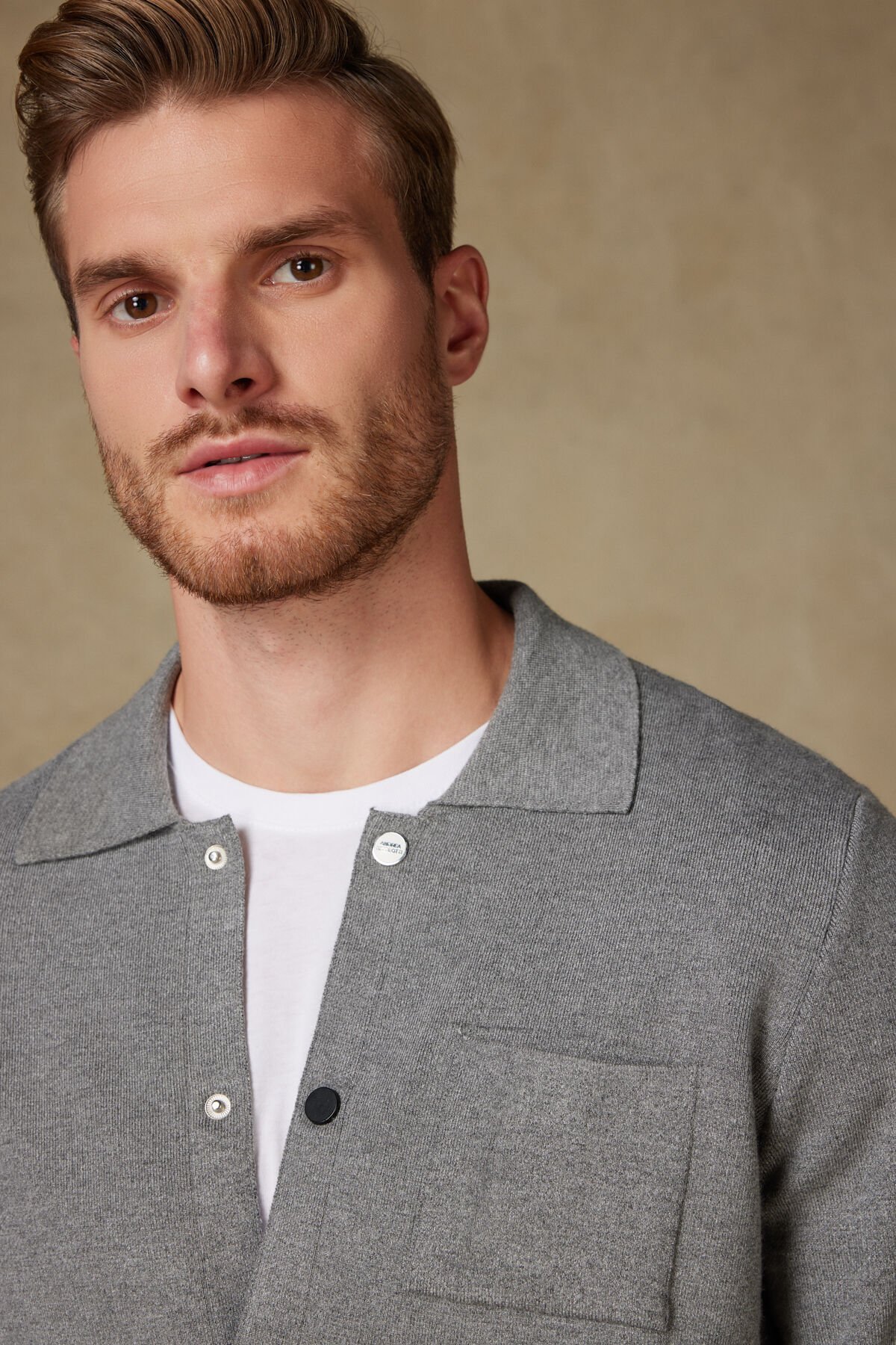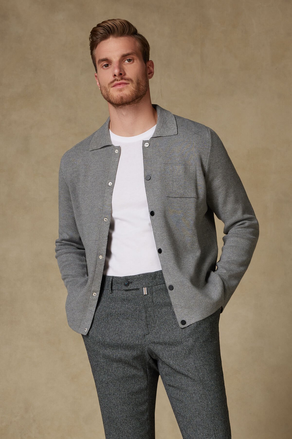 Bu açık gri örme gömlek ceket, %52 Viskon, %21 Poliamid ve %27 PBT karışımı sayesinde yumuşak, hafif ve esnek bir yapıya sahiptir. Viskon içeriği ürüne doğal bir döküm ve ipeksi bir dokunuş sağlarken, Poliamid ve PBT lifleri dayanıklılığı ve form koruma özelliğini artırır. Gömlek yakalı kesimi, çıtçıt düğmeli ön kapaması ve tek göğüs cebi, ürüne modern ve rahat bir gömlek ceket (shacket) görünümü verir. İlkbahar ve sonbahar aylarında dış giyim veya iç mekanda katmanlama için idealdir.