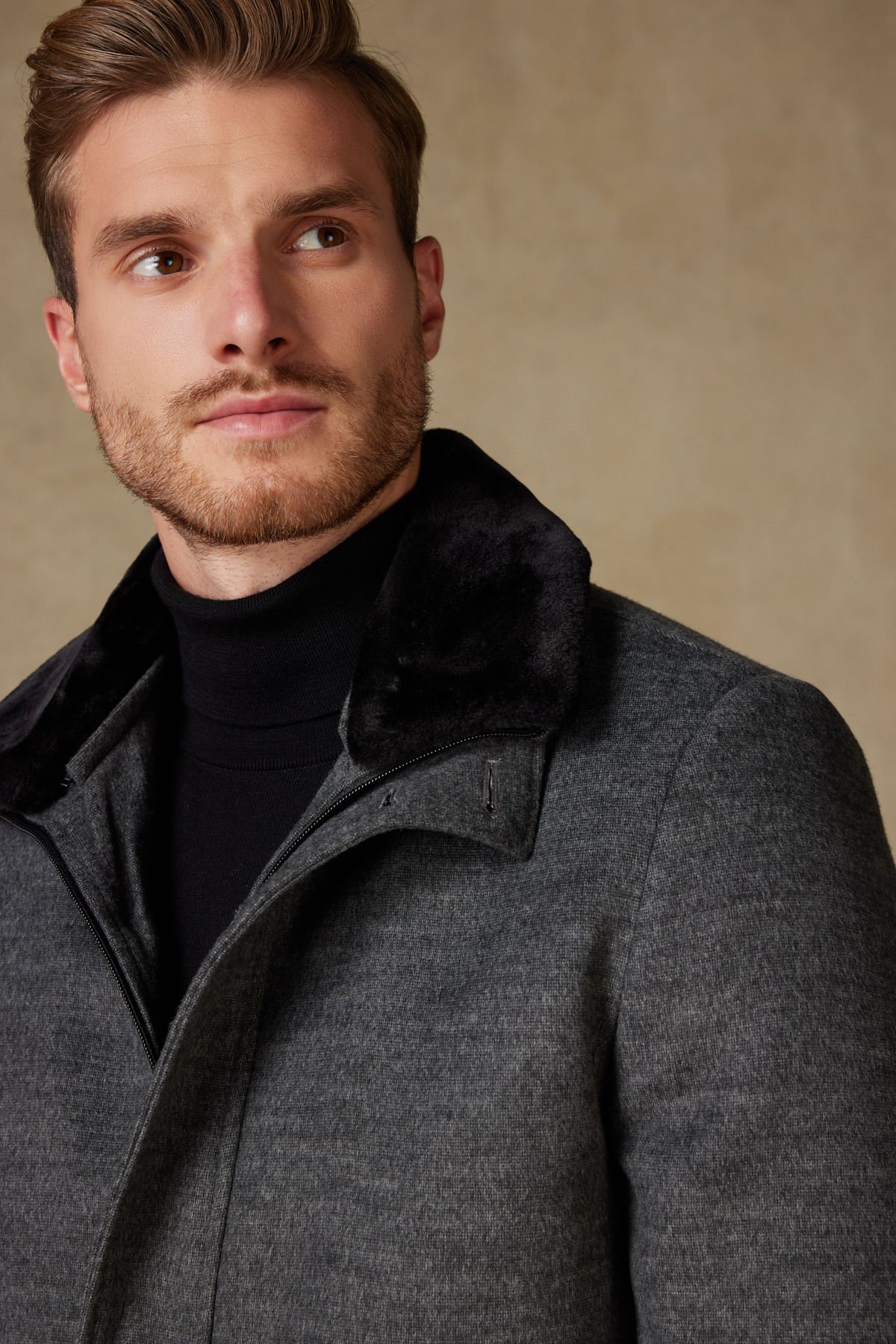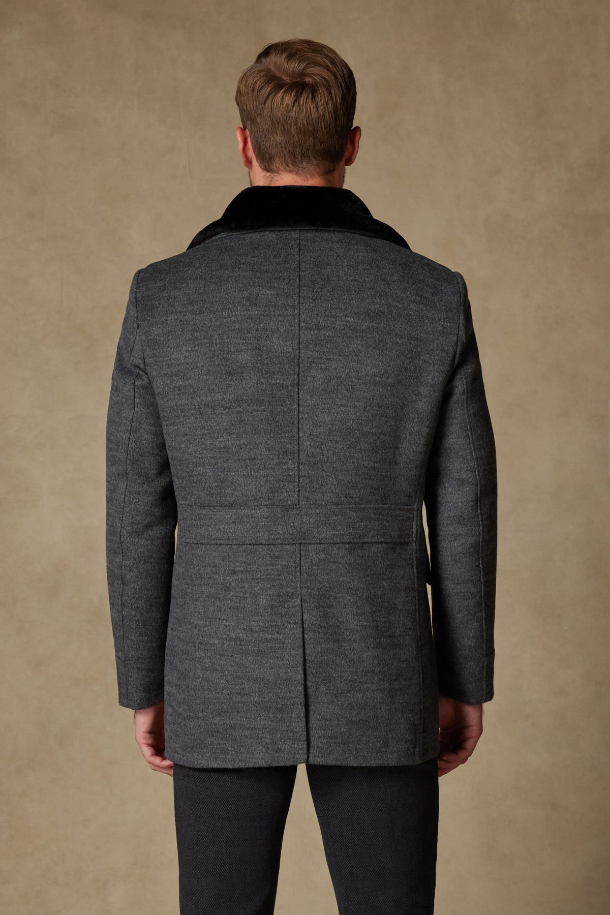 Bu Andrea Nicolotti koyu gri kaban, kış aylarında hem şıklığı hem de sıcaklığı bir arada arayan modern erkekler için tasarlandı. Kaşe görünümlü lüks kumaşı, klasik çizgisini korurken, çıkarılabilir siyah kürk yakası sayesinde farklı kombinlere kolayca adapte olabilen dinamik bir yapı sunar.