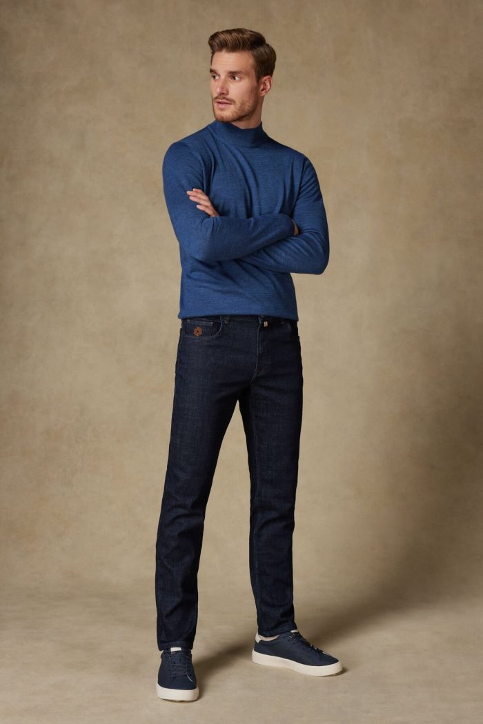 - Casual: Mavi melanj balıkçı yaka triko ile sade ve dinamik bir görünüm yakalayın. Lacivert sneaker’lar bu kombini tamamlar.