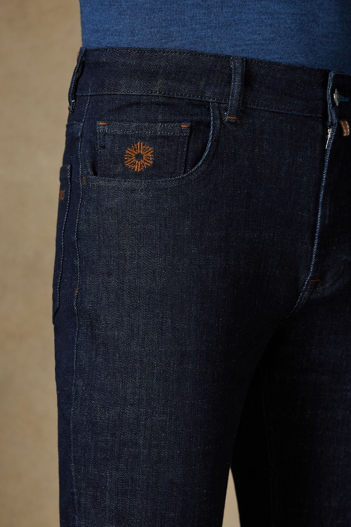 Kumaş üzerindeki koyu indigo mavisi (Raw Denim’e yakın) görünümü, temiz ve modern bir estetik sunar. Yüksek oranda Pamuk ve eklenen %2 Elastan ile dayanıklılığı ve esnekliği artırılmıştır. Klasik 5 cep detayına sahip olan pantolonun arka cep üzerindeki nakış ve deri yama, markanın kaliteli ve özenli işçiliğini vurgular.