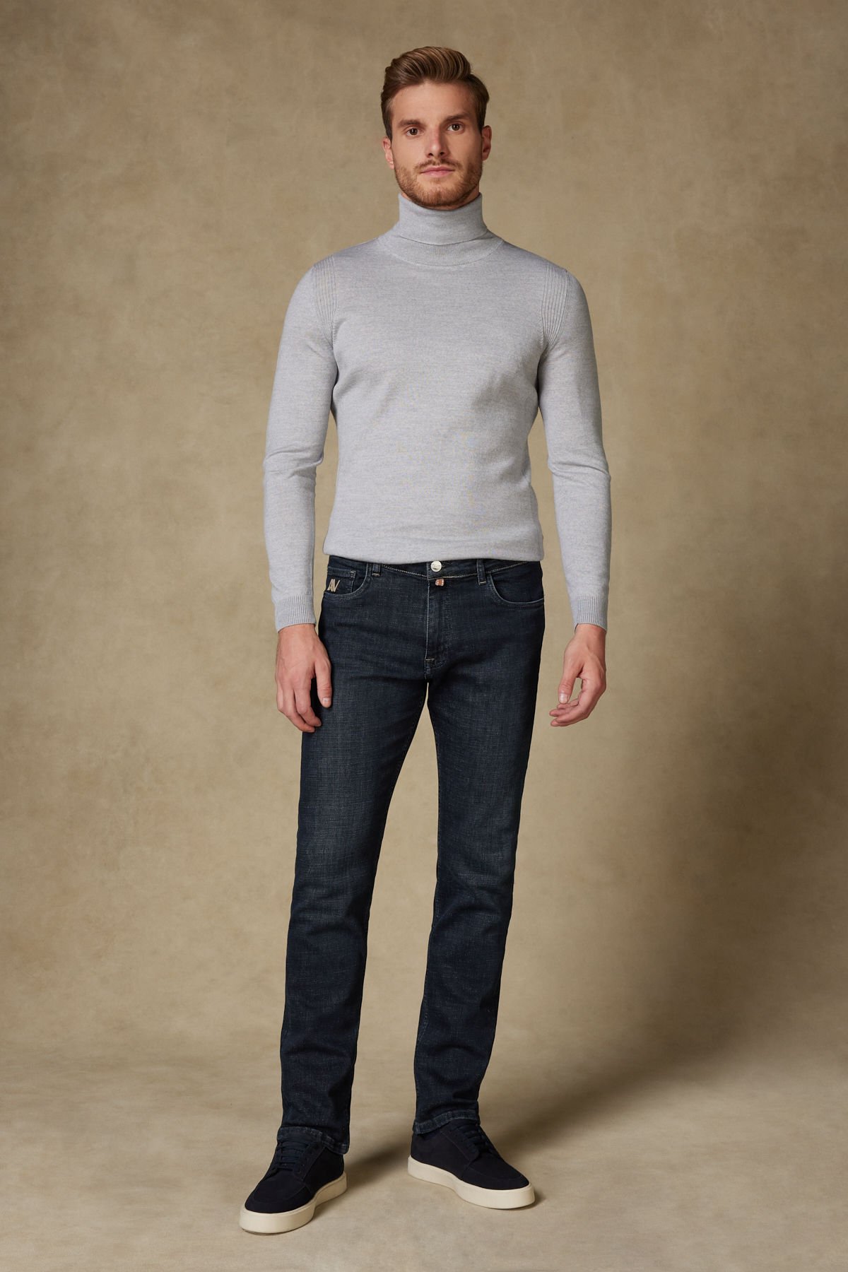 • Smart Casual: Modelde görüldüğü gibi, gri veya açık mavi gibi düz renkli yarım balıkçı yaka (mock neck) triko ile sade ve dinamik bir görünüm yakalayın. Koyu renkli sneaker’lar veya deri botlar bu kombini tamamlar.