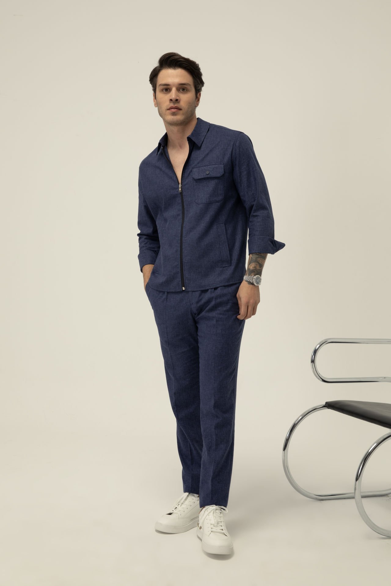 Bu fermuarlı gömlek ceketi, aynı kumaştan veya benzer lacivert tonlardaki bir pantolonla takım olarak kullanabilir veya beyaz bir tişört üzerine dış katman olarak giyerek modern ve sportif bir casual stil oluşturabilirsiniz.