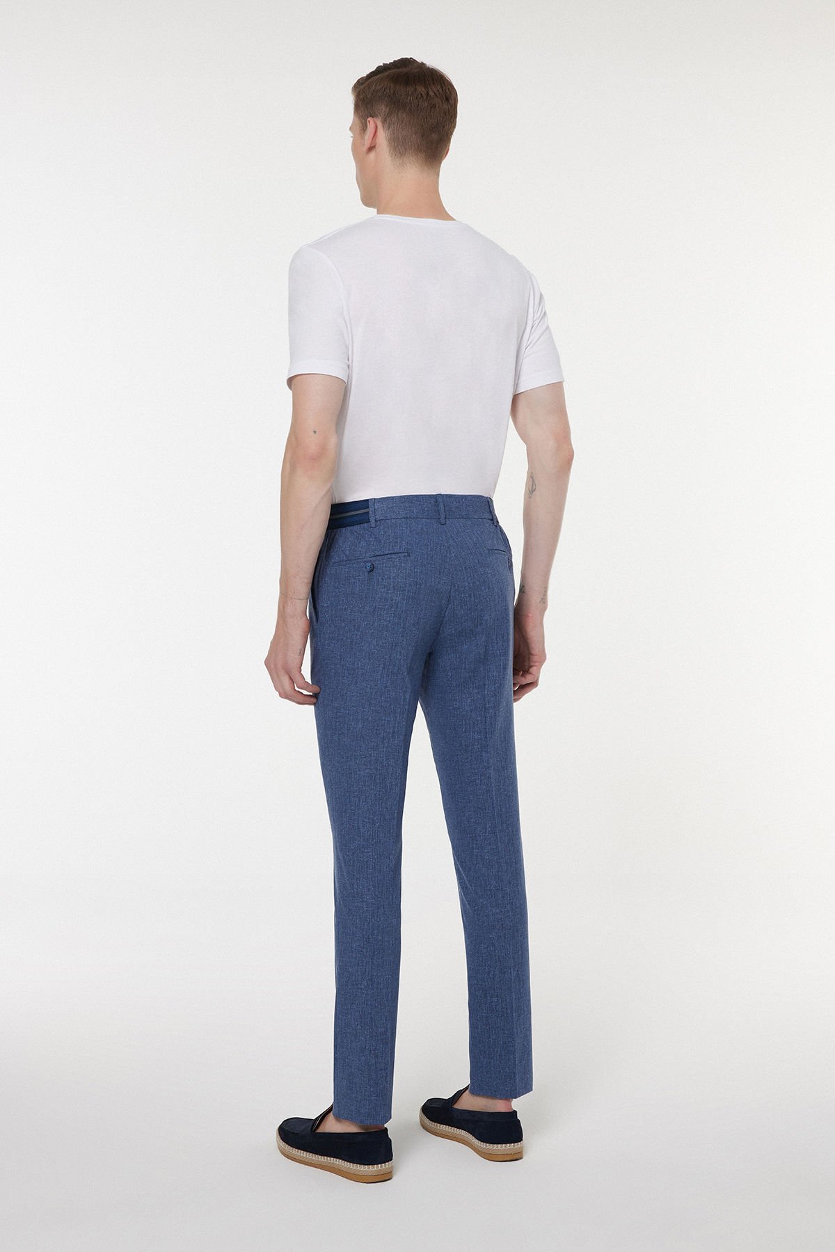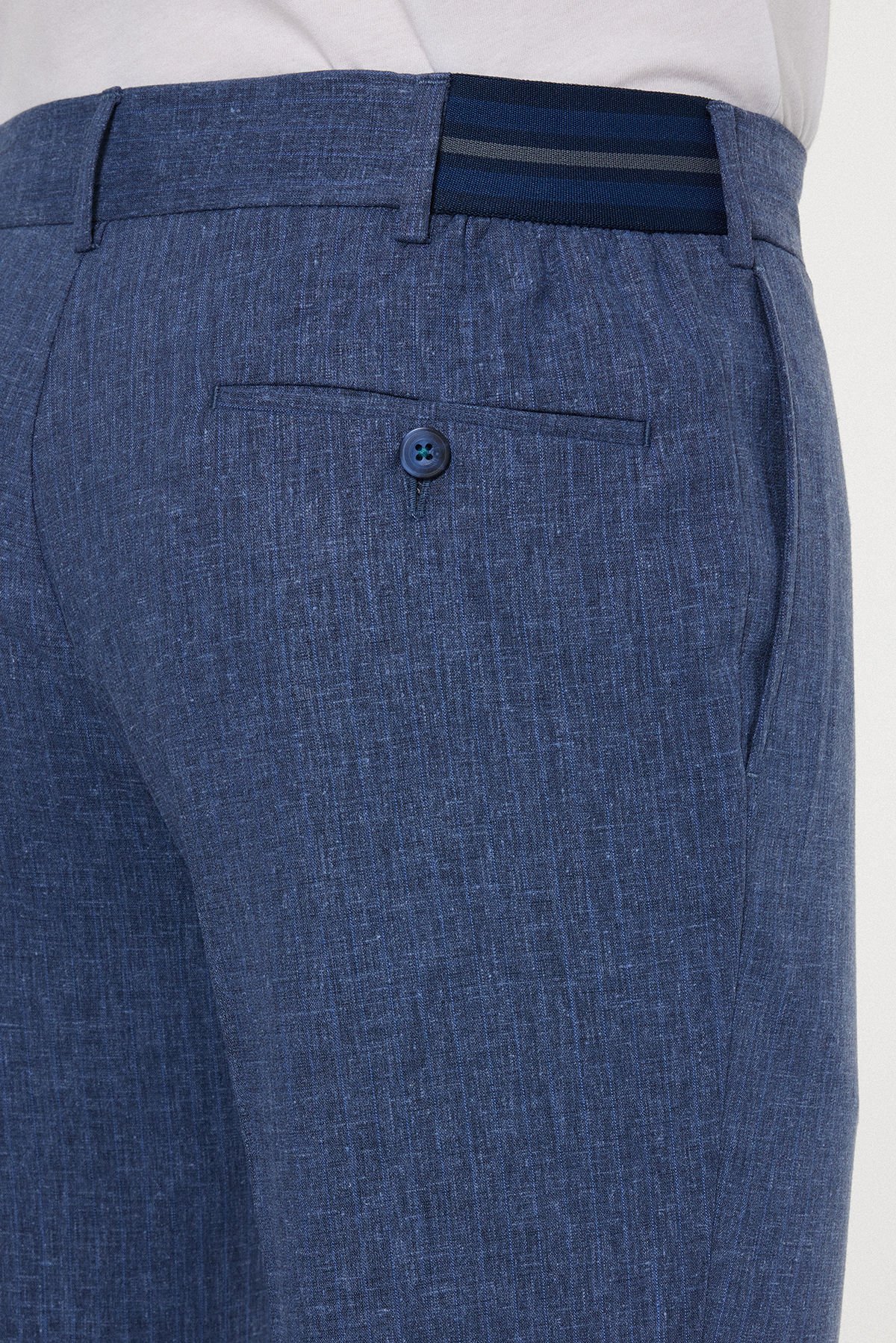 Geleneksel kumaş pantolon şıklığını, özellikle sıcak mevsimlerde üstün konfor sunan teknik bir harmanla buluşturan bu mavi parça, smart casual stilinize yeni bir boyut getiriyor. Kumaş kompozisyonundaki %48 Keten, doğal bir nefes alabilirlik ve hafiflik sağlarken; %50 Polyester dayanıklılığı, %2 Elastan ise esnekliği ve hareket özgürlüğünü garanti eder. Klasik mavi tonu, iş ortamlarından sosyal etkinliklere kadar geniş bir yelpazede zahmetsizce kullanılabilir. Kemer içi gizli lastik detayı, rahatlığı ve fit duruşu bir araya getirir.