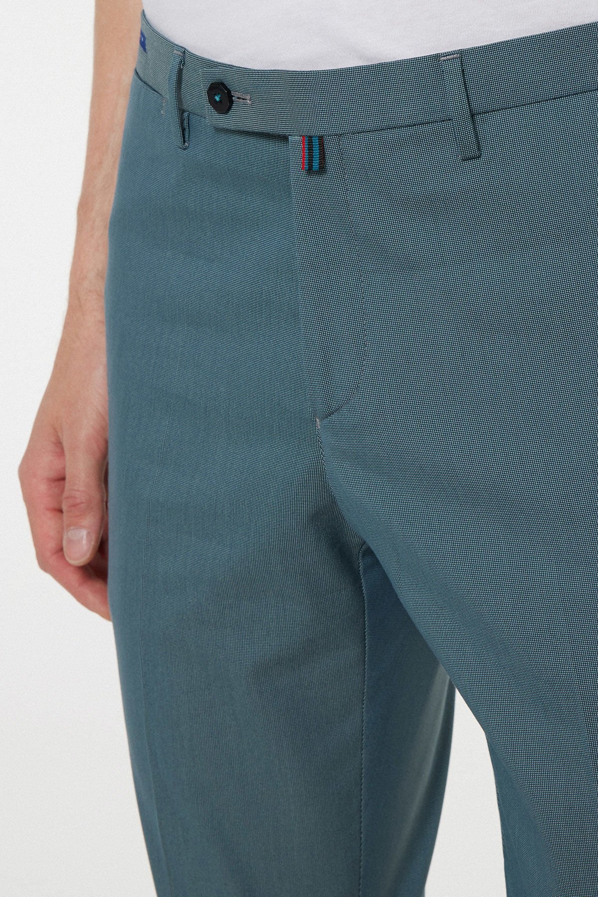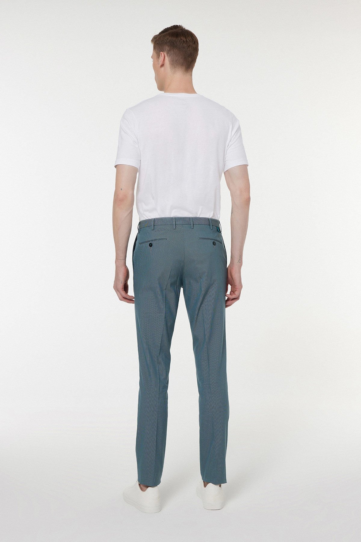 Klasik kumaş pantolon şıklığını, güncel renk trendleri ve üstün konforla birleştiren bu petrol yeşili model, smart casual görünümlerinize derinlik katacaktır. Kumaş kompozisyonundaki %60 Pamuk içeriği, doğal bir yumuşaklık ve nefes alabilirlik sunarken; %38 Polyester dayanıklılığı ve form koruma özelliğini artırır. %2 Elastan katkısı ise gün boyu kısıtlanmamış hareket serbestliği ve esneklik sağlar.